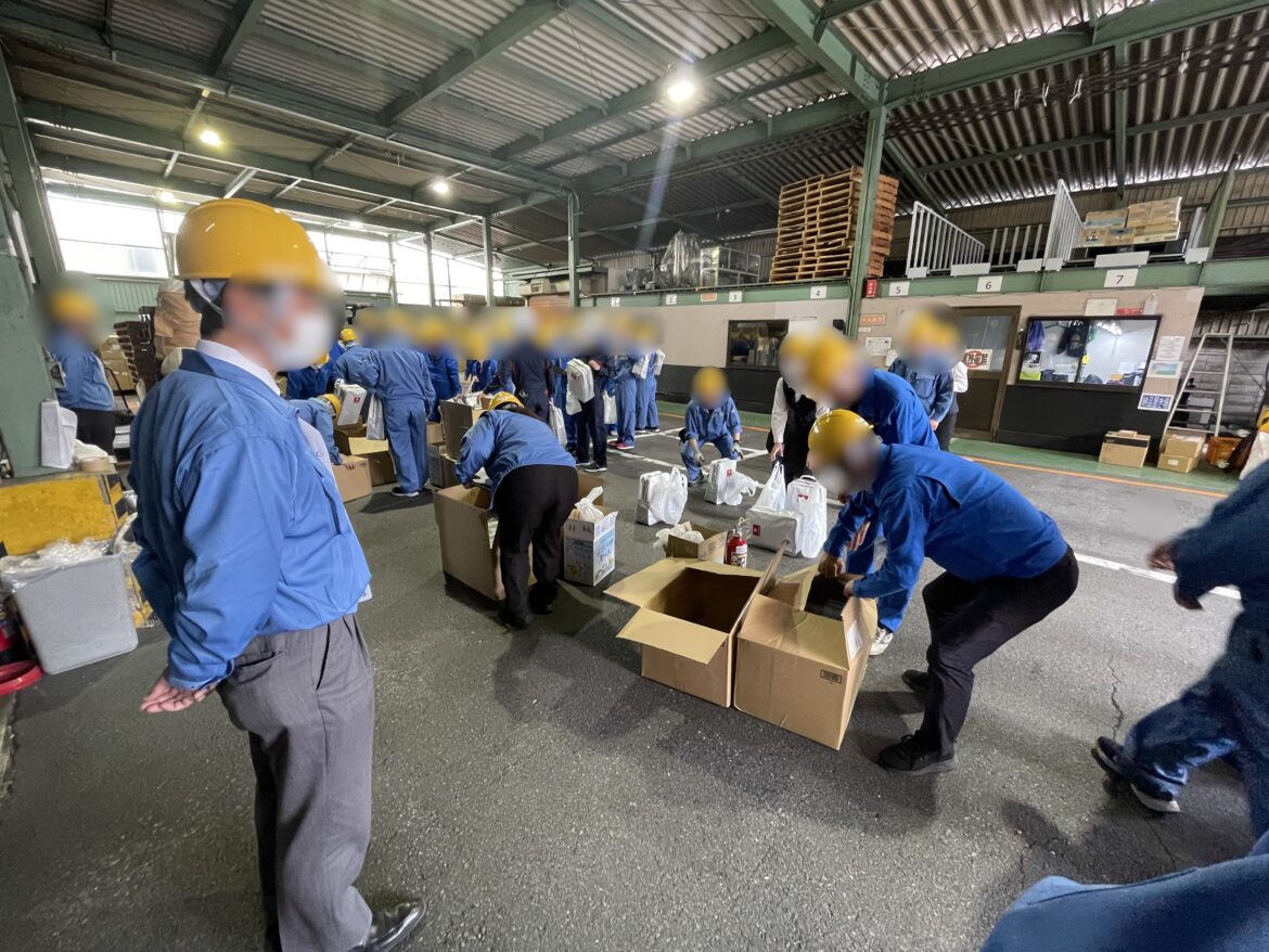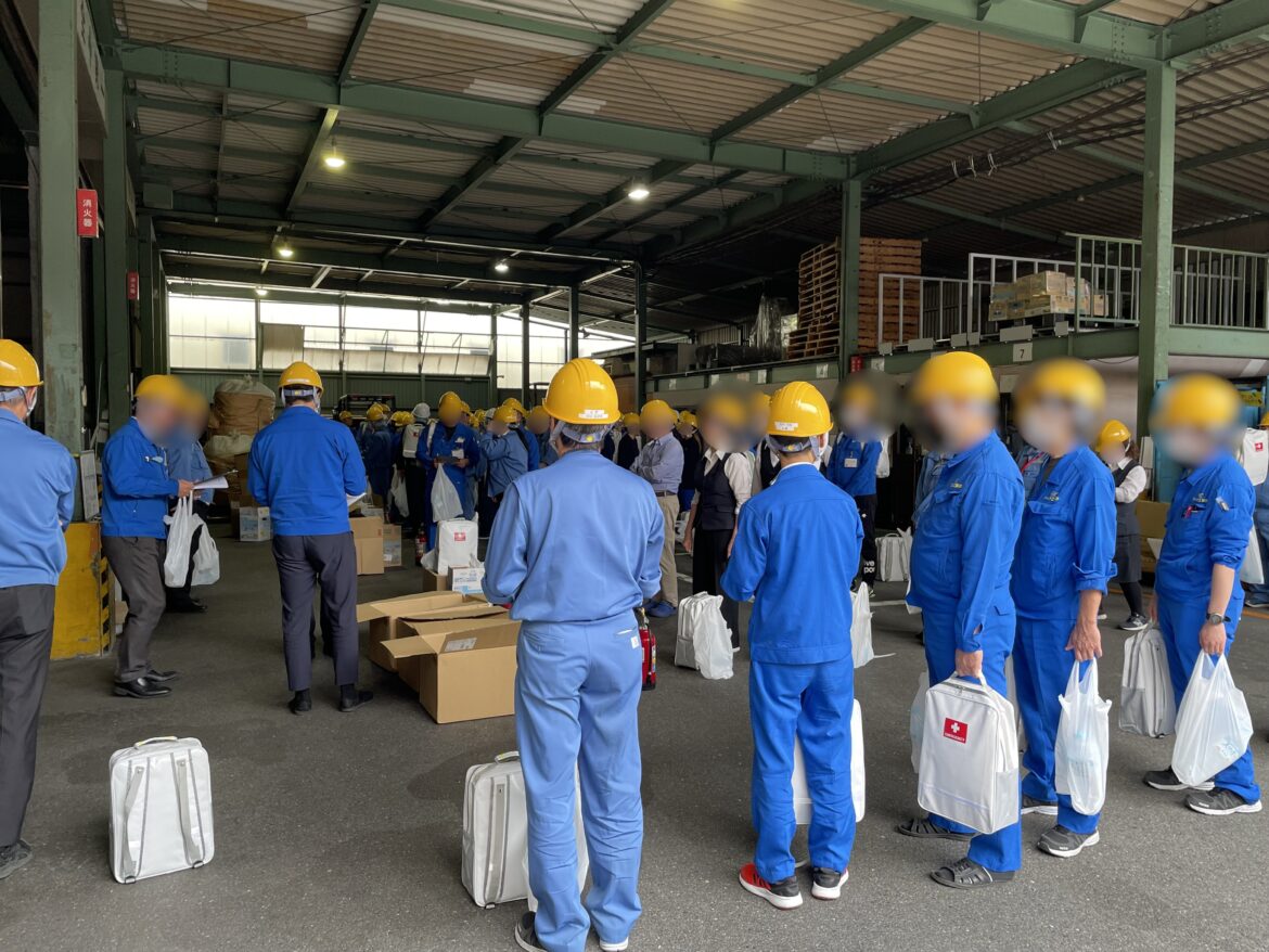 避難訓練を通じて、防災意識を再確認。安全第一で、これからも安心して働ける職場づくりを目指します。社員一人一人に防災セットを準備しており、今回はその配布訓練も兼ねています。